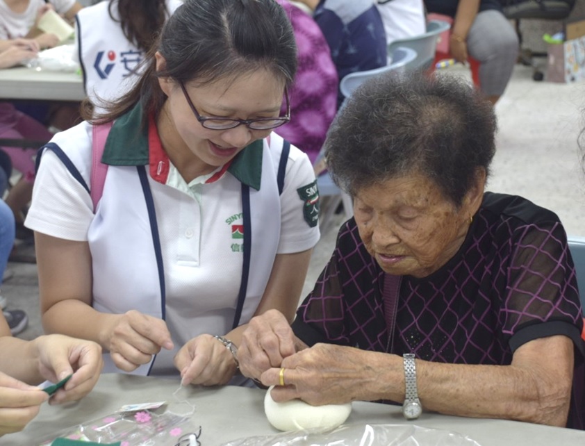 「請安信志工幫忙阿公、阿嬤把棉花塞滿,再用線繞6圈拉斷,就會做出白胖胖的臉頰囉」,按著講師說明,安信志工與長輩通力完成一隻隻可愛的柚子兔,這看似簡單的DIY步驟,可以幫助長輩增加手部的運動。而溫馴的狗醫生登場時,長輩露出孩子般的燦爛笑容,開心的撫摸牠們,並進行多個趣味的互動遊戲,讓現場充滿了歡樂的笑聲,安信同仁也被現場的氣氛療癒了,實為難忘的志工日回憶。
